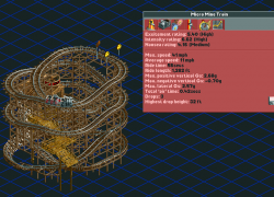 Another coaster inspired by Stu's Route 66. This time a mine train. It needs to be sunk down 4 units, and it can be tunneled. Ironically, it gets a higher excitement just from the open pit as opposed to being tunneled. The queue is only one tile, but with two car trains, it's not a huge issue. Two laps will get you over 6 excitement if needed.